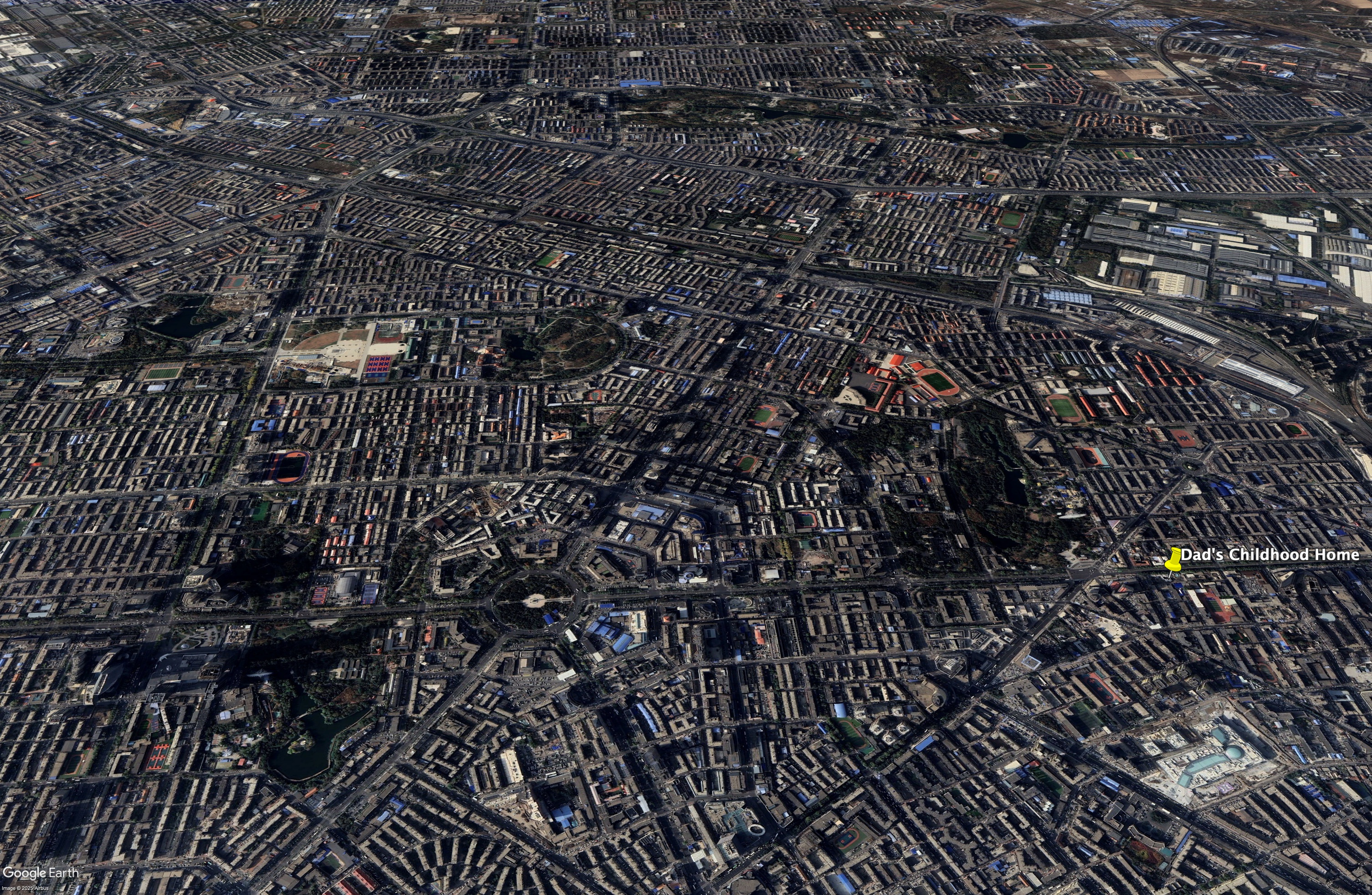 Panaromic View of 新民广场 (renamed) and 人民大街 and it’s vicinity to my Dad’s Childhood Home. Google Earth. 2024.